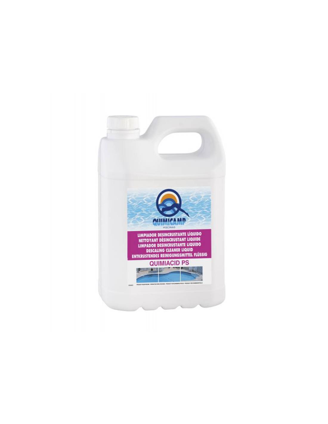 Desincrustante Limpiador Líquido Acido Potenciado para 50L Bote 5L. Producto para eliminar y quitar incrustaciones fuertes, limpiar superficies y el vaso de la piscina de algas. Producto fuertemente ácido. No usar nunca ni en filtros, ni en tuberías o superficies metálicas. Utilícese guantes adecuados.