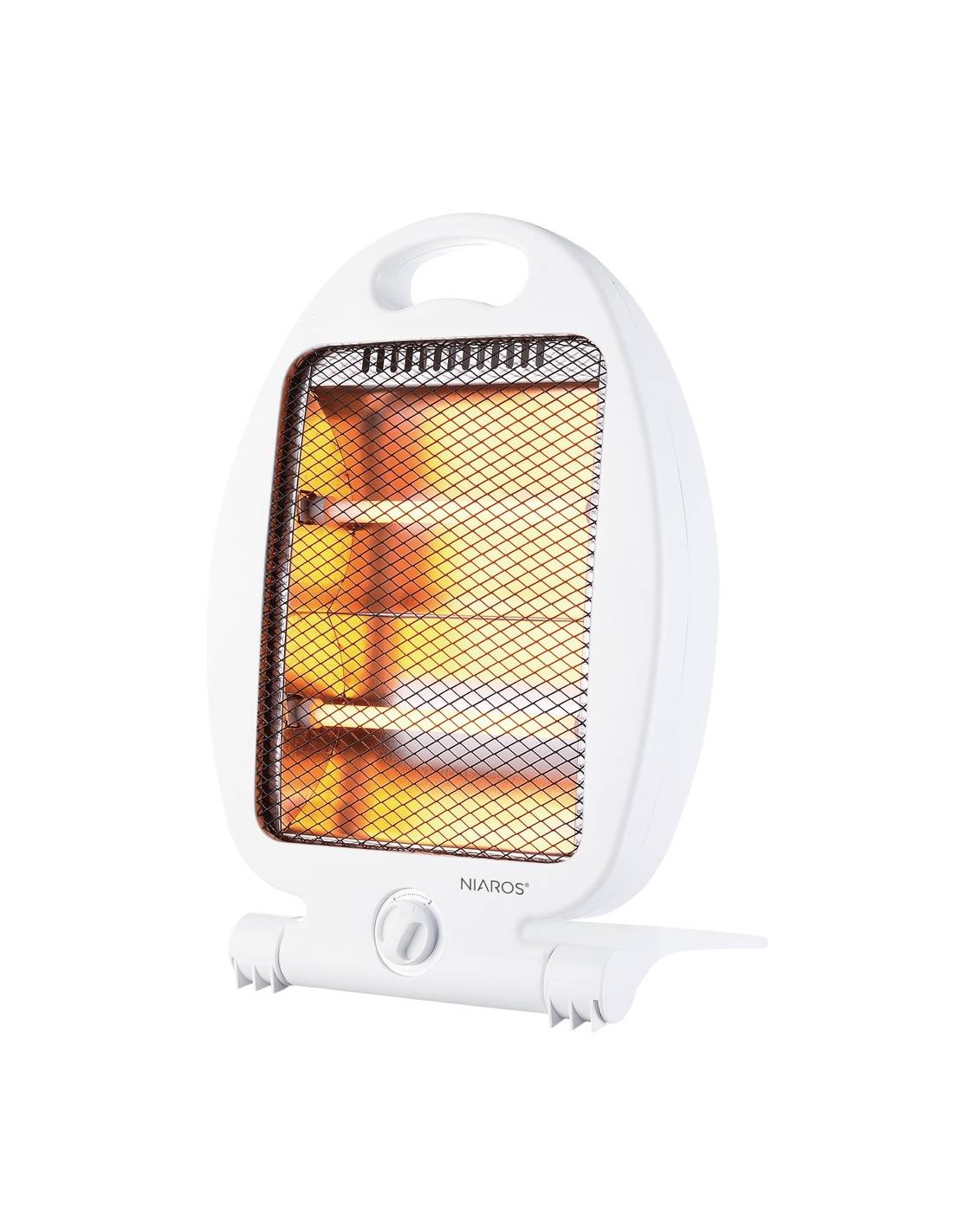 Radiador de Cuarzo 240V 800W 50Hz Blanca. 2 Tubos con Interruptor Independiente. Dispositivo Antivuelco ( se detiene automáticamente si vuelca). IP 20. Material Polipropileno (PP). Rejilla. Asa. Área de cobertura 20m2.
